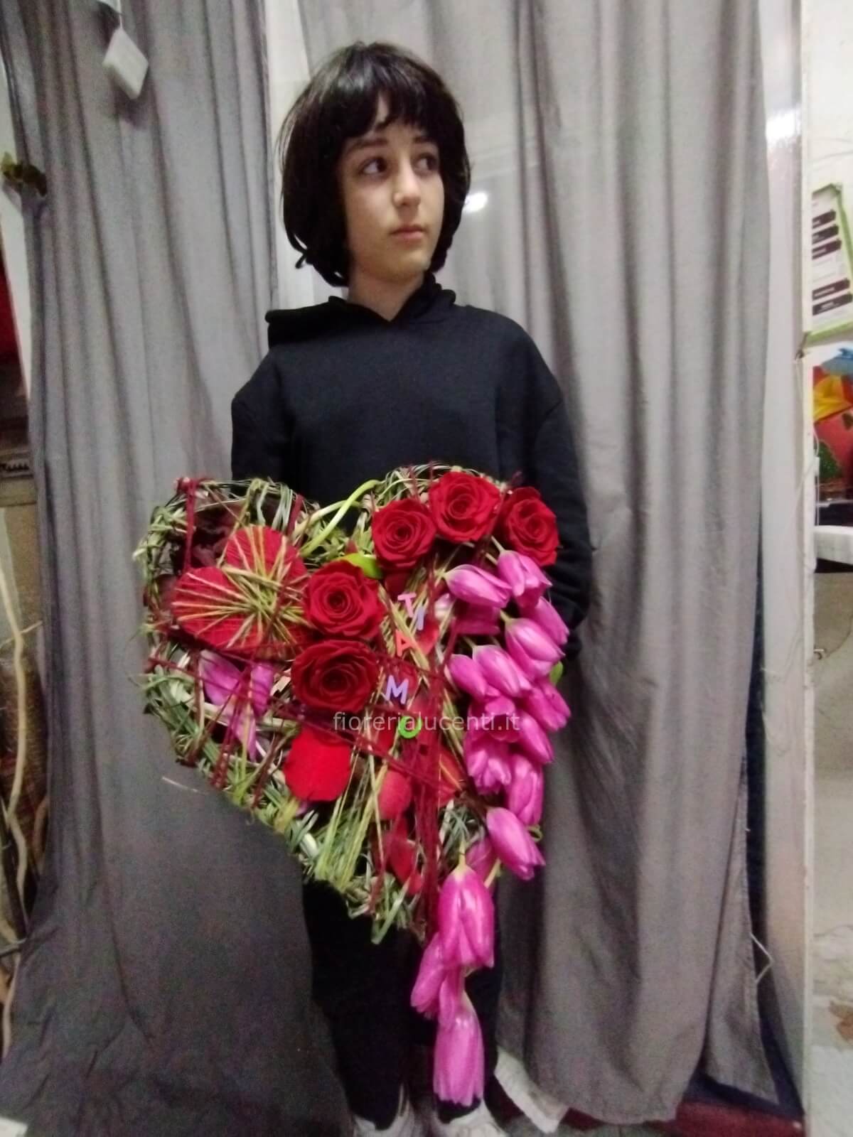 Mazzo a cuore con rose e fiori ti stagione